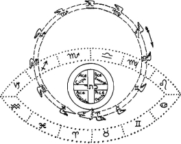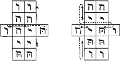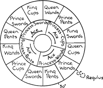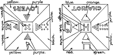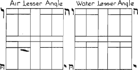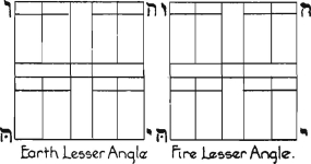If we now examine the Boards we shall see that the Aries system of any Lesser Angle is joined diagonally to the Aries system of the other three Lesser Angles; and that the Cancer also is similarly joined to every other Cancer system. So that we have two systems of squares; viz: the Aries and the Cancer; of the whole, each containing four squares allotted to every sign it contains. This resembles the black and white systems of squares of the ordinary board; and it is as if we allotted the White to Aries, and the black to Cancer.