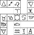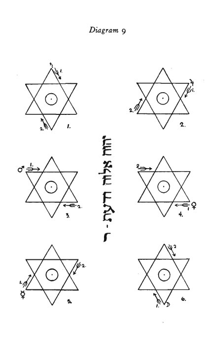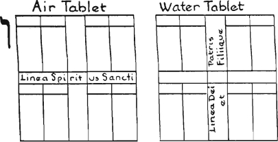 Every Lesser Angle throughout the Tablets has a diagonal line of four squares starting from its prime square; which are allotted respectively to Aries, Gemini, Scorpio and Earth. From these four squares the Bishops can move one square into a square of Libra, Sagittarius, Taurus or Water, these completing the series of squares in that Lesser Angle ;n which a Bishop can move. Let us call this the Aries System of diagonal squares.