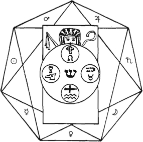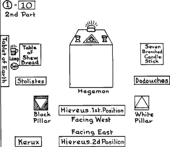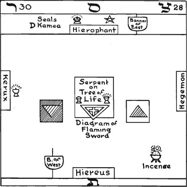 balanced movement. Yet in his beginning of action is he at first a mute force, as though throned upon the water; as in the end of his action he is a life manifested and throned upon the earth. And herein is a mystery of the Lord Aeshoori (Osiris) when enthroned between Isis and Nephthys, thus representing the beginning and end of the action of Him in whom end and beginning are not, but rather concealment and then manifestation. Herein is a great mystery of life, for His Thrones are not in the two active elements, seeing that these latter are his horse and chariot of transition in the passage from concealment into manifestation. This piece, then, is the symboliser of the action of the potencies of the crosses on the Servient Squares.