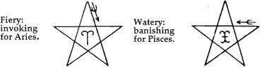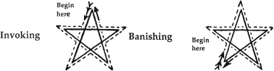 Using the description of this ritual in the First Knowledge lecture as a guide, with right hand at full extension straight ahead, the Banishing Pentagram begins just opposite the left hip tracing a large inverted "V" down to the right hip crossing up to and outwards from the left shoulder, over to the right shoulder, and then most importantly reconnecting at the starting point. The dagger is never lowered and also traces a circle connecting each pentagram. The tracing is imagined as blue flame flecked with gold, not unlike a gas flame. The four archangels are imagined as towering figures which bring a refreshing Air from the East, cleansing Water from the West, purifying Fire from the South, and Earth as a stabilizer in perseverance from the North. The ritual is performed without expecting results, change, or power, but quietly persevered in for a full year while carefully noting how it affects the personality and outer life. Ideally, the ritual should be performed in the same location apart from the gaze of others, and if possible, in a place set apart from day to day interference.